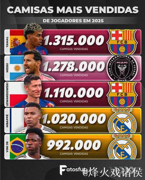 2025球衣销量排名:亚马尔登顶,梅西第二,C罗跌至第七!时代已变?